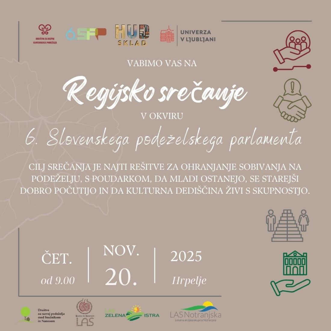 Lokalna akcijska skupina (LAS) Notranjska vas skupaj s partnerji vabi na regijsko srečanje 6. slovenskega podeželskega parlamenta, ki bo v četrtek, 20. novembra 2025, ob 9.00 v Hrpeljah.