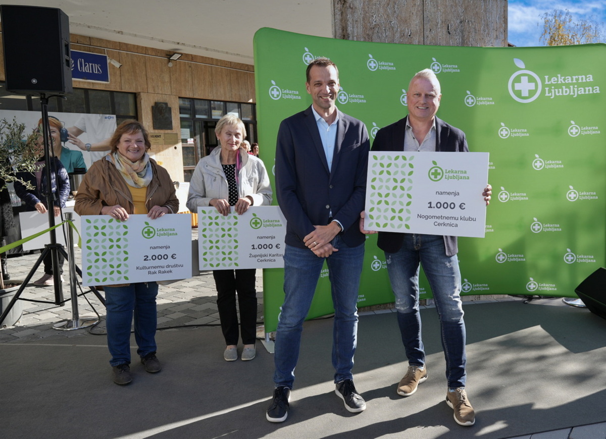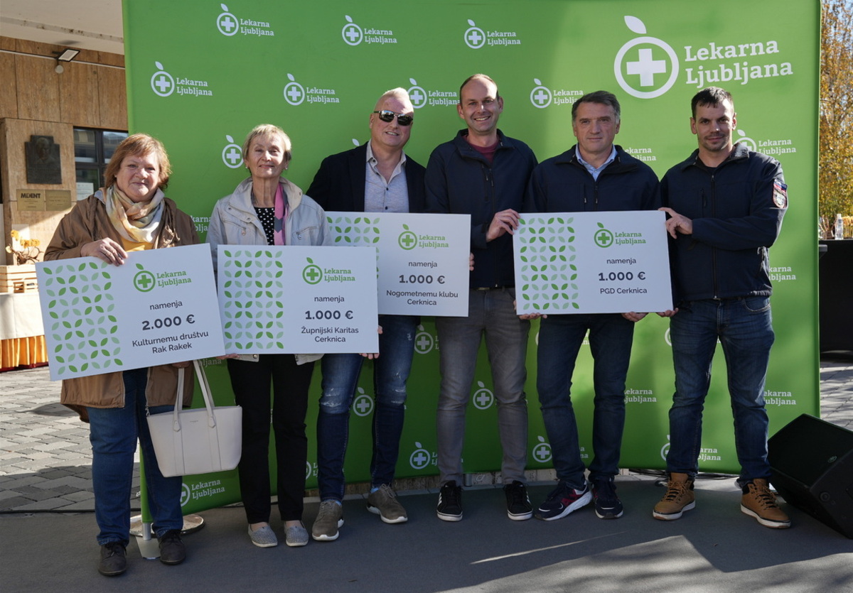 Lekarna Ljubljana je kot družbeno odgovoren zavod ob odprtju nove enote predala tudi donacije lokalnim društvom – Kulturnemu društvu Rak Rakek (2.000 €), Nogometnemu klubu Cerknica (1.000 €), Župnijski Karitas Cerknica (1.000 €) in PGD Cerknica (1.000 €).