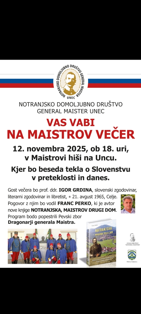 Notranjsko domoljubno društvo general Maister Unec vabi na Maistrov večer z gostom, slovenskim zgodovinarjem prof. ddr. Igorjem Grdino, ki bo 12. novembra 2025 ob 18.00 v Maistrovi hiši.