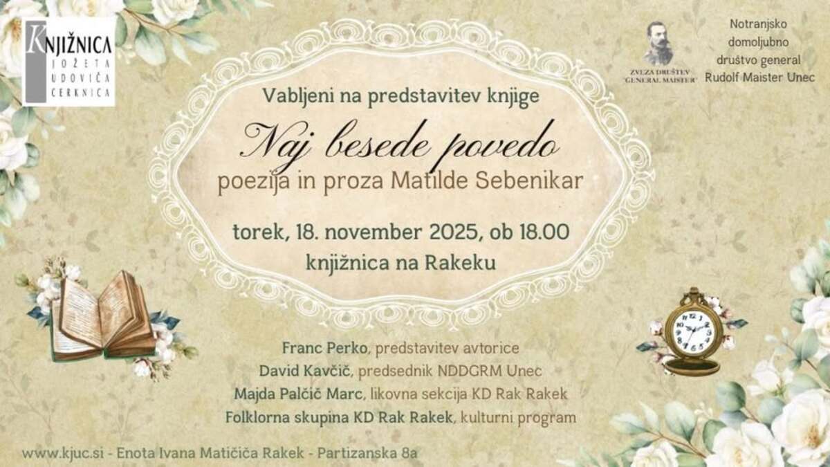 Notranjsko domoljubno društvo general Maister in Knjižnica Jožeta Udoviča Cerknica v torek, 18. novembra 2025, ob 18.00 vabita na predstavitev knjige Naj besede povedo, poezija in proza Matilde Sebenikar v rakovški knjižnici.