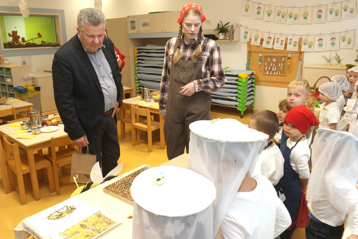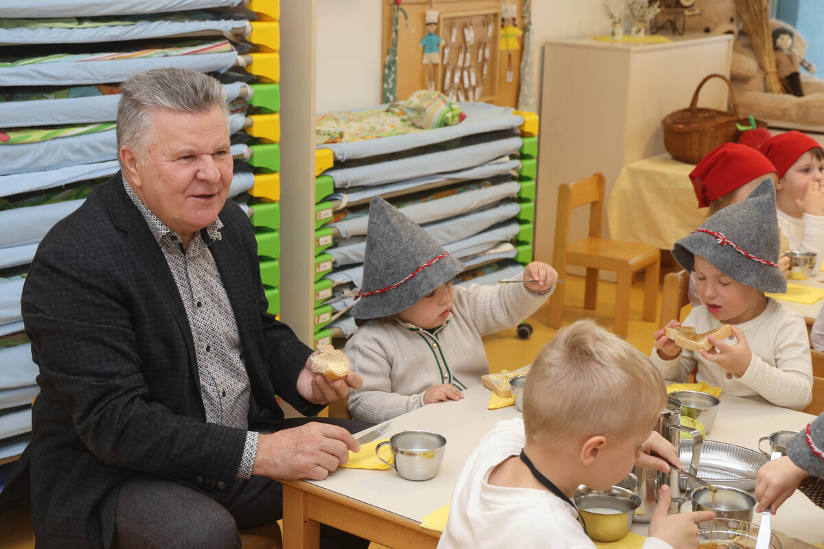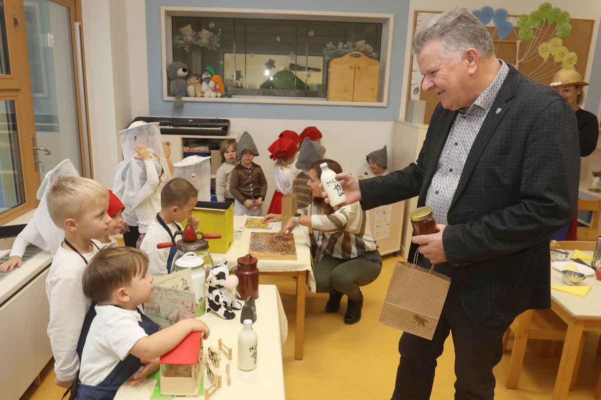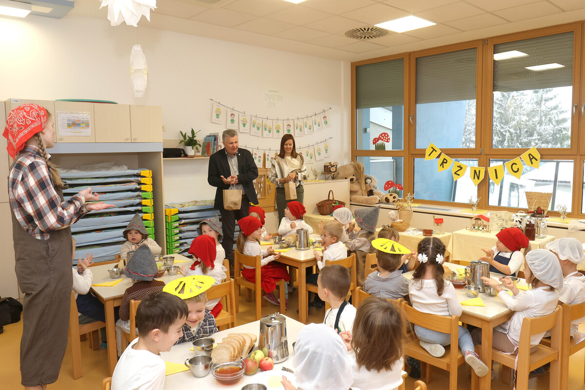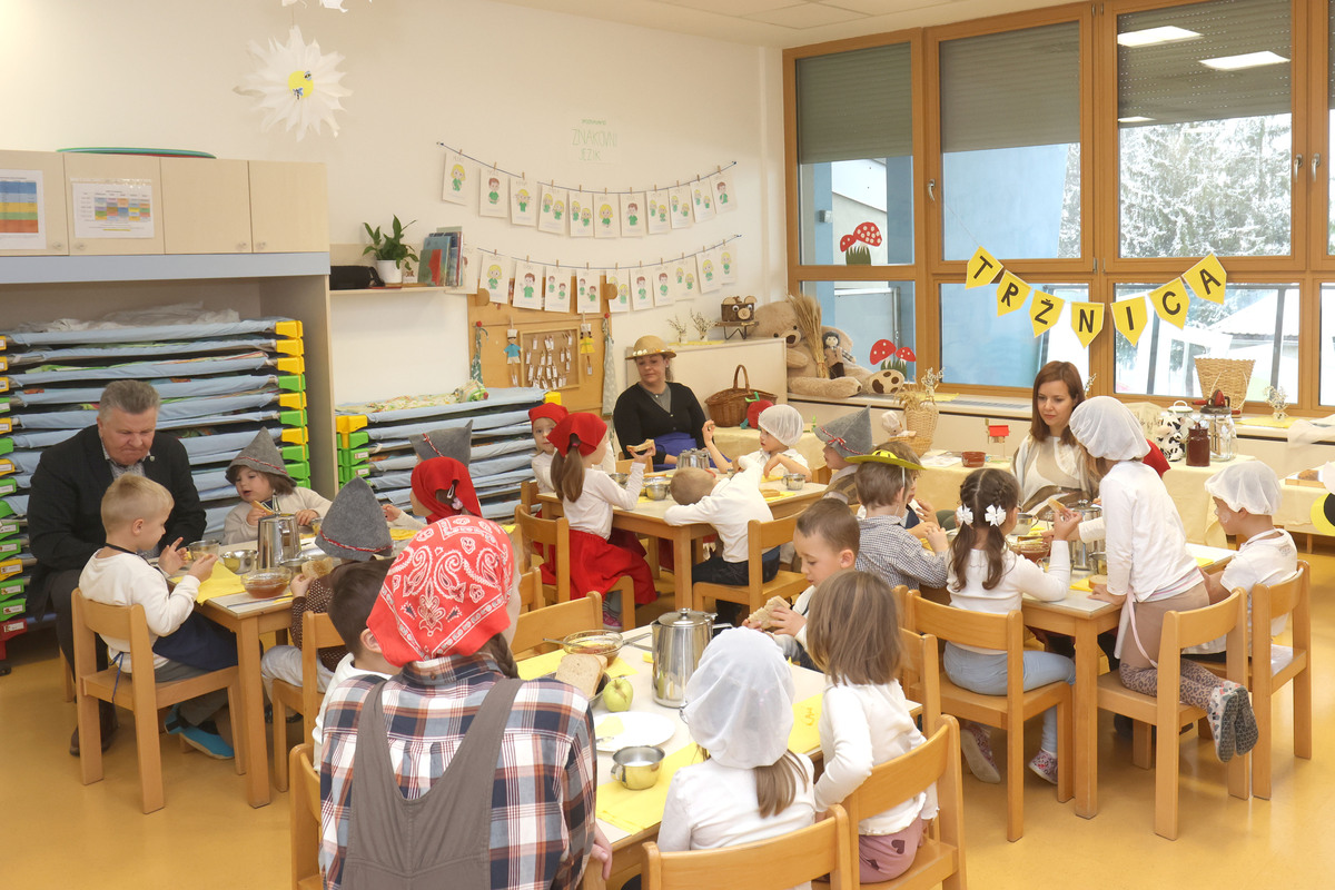 Tradicionalni slovenski zajtrk je župan Marko Rupar skupaj z ravnateljico Jasno Maček zajtrkoval pri otrocih iz skupine Medvedki Vrtca Martin Krpan Cerknica in bil presenečen nad programom in kuliso, ki so ju pripravili otroci in vzgojiteljici.
