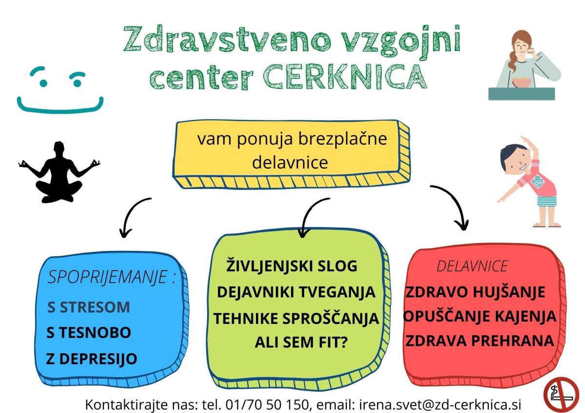 Iz Zdravstvenega doma Cerknica sporočajo, da je zaživela nova Facebook (FB) stran Zdravstveno vzgojnega centra Cerknica, do katere lahko dostopate na povezavi. Na njej bodo objavljali nove termine brezplačnih delavnic kot so Spoprijemanje s stresom, Tehnike sproščanja, Zdravo jem, ki se bodo začele izvajati v mesecu maju.